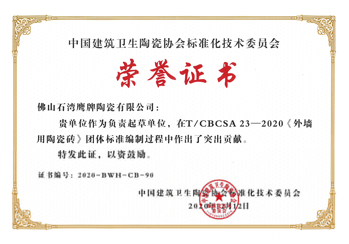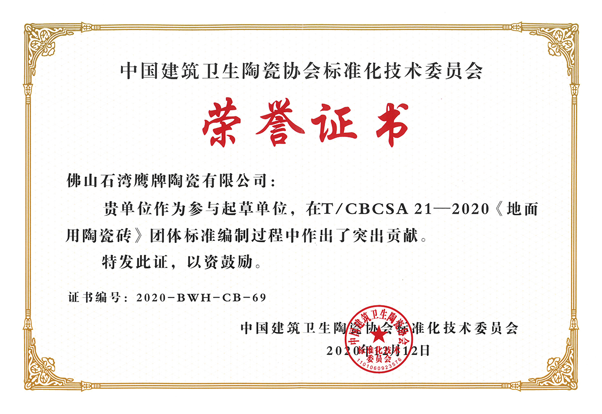 • 《地面用陶瓷磚》團(tuán)體標(biāo)準(zhǔn)編制過程中作出突出貢獻(xiàn)