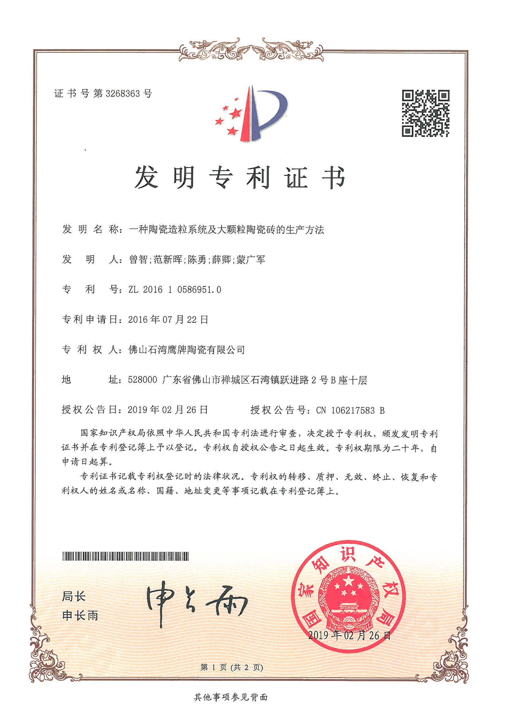 • 陶瓷磚生產(chǎn)方法發(fā)明專利證書