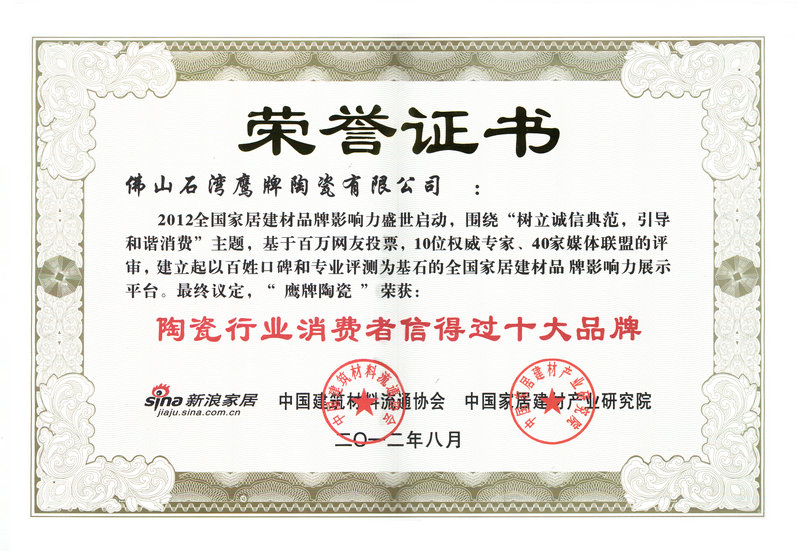 2012陶瓷行業(yè)消費者信得過十大品牌獎書