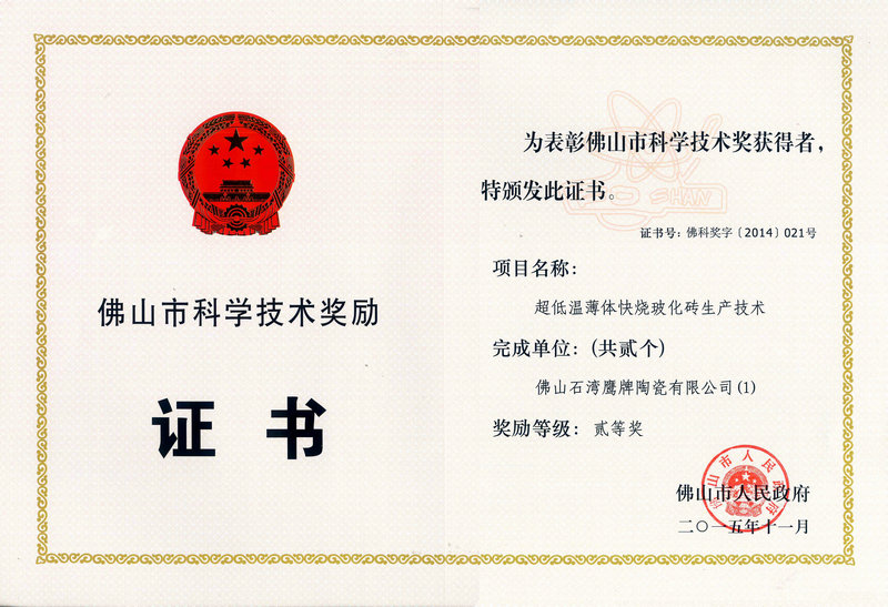 • 2015年市科技進(jìn)步二等獎超低溫薄體快燒?;u生產(chǎn)技術(shù)(石灣鷹牌)