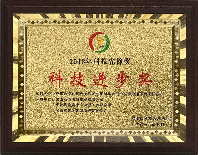 • 2018年科技先鋒進(jìn)步獎(應(yīng)用數(shù)字化復(fù)合裝飾工藝研制具有凹凸紋理的通體大理石瓷磚)