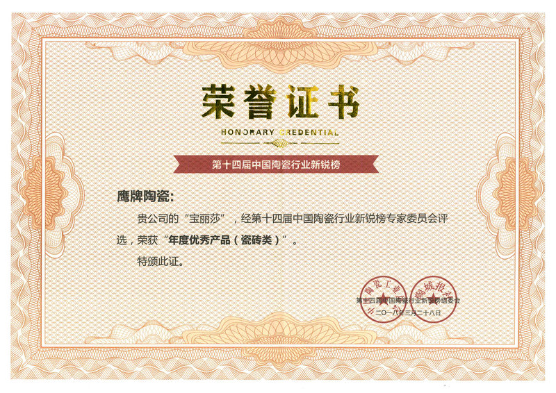 • 第十四屆中國陶瓷行業(yè)新銳榜年度優(yōu)秀產(chǎn)品(瓷磚類)寶麗莎