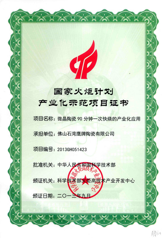 國家火炬計劃產(chǎn)業(yè)化示范項目證書