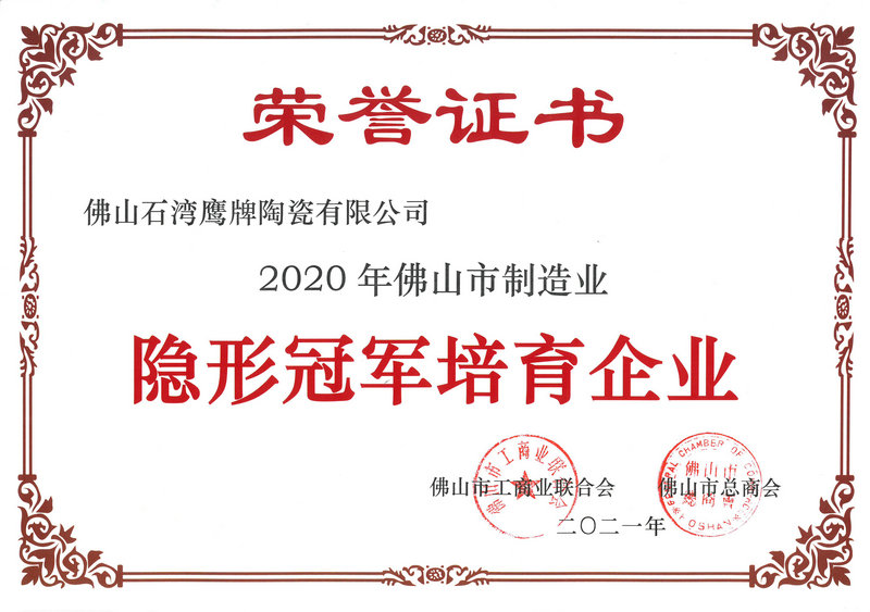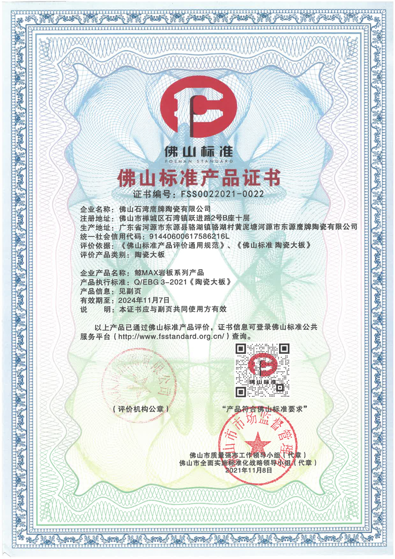 鷹牌瓷質(zhì)拋釉磚-900x900x11mm獲獎證書