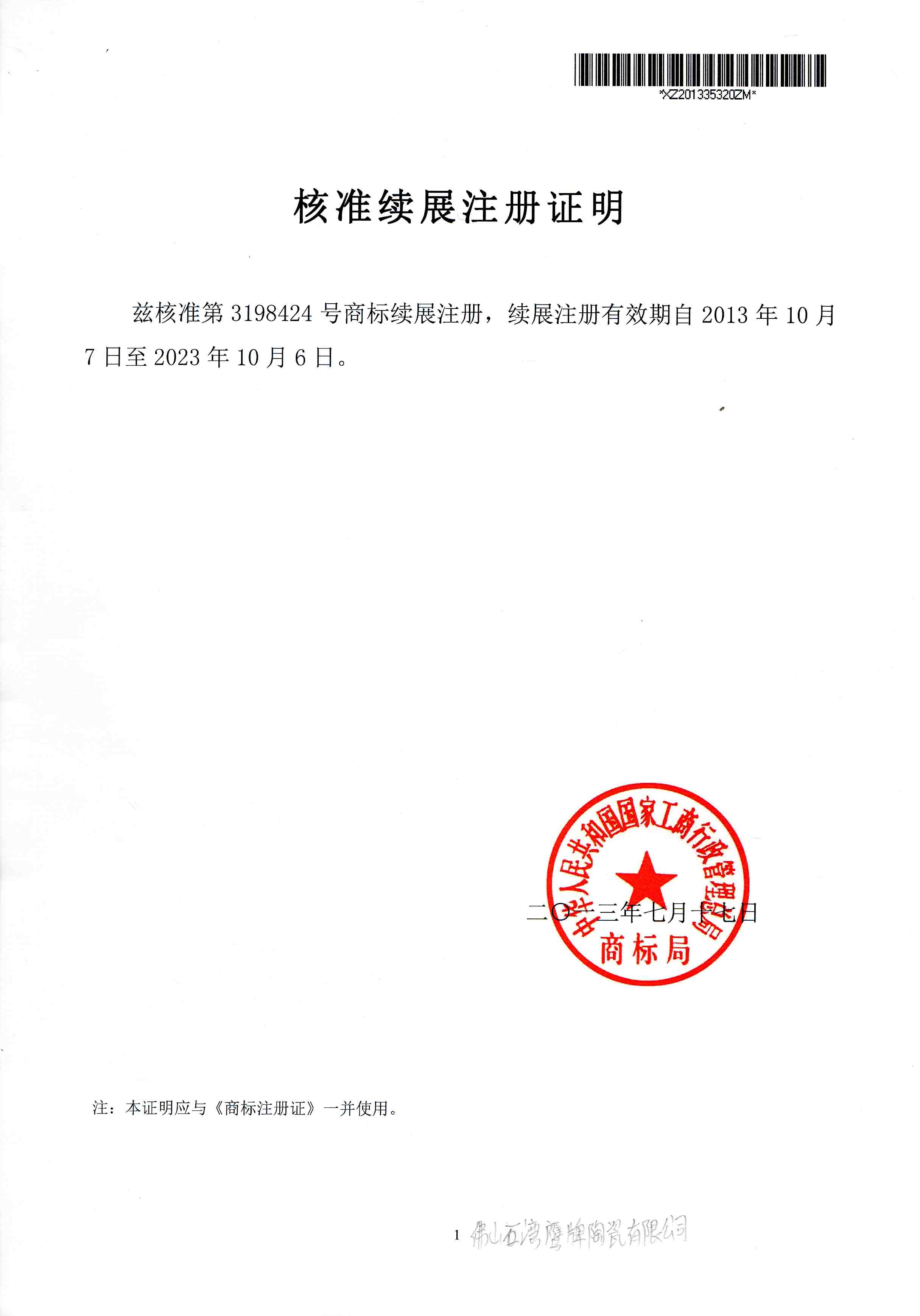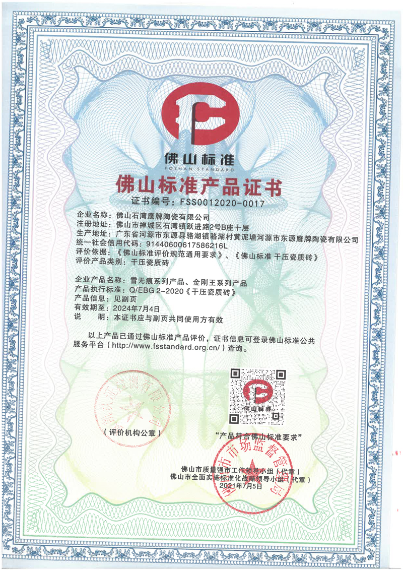 雪無痕、金剛王佛山標(biāo)準(zhǔn)產(chǎn)品證書