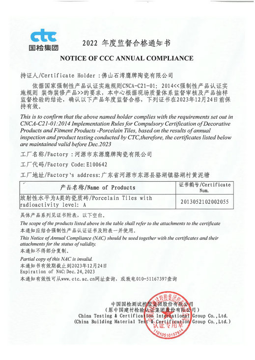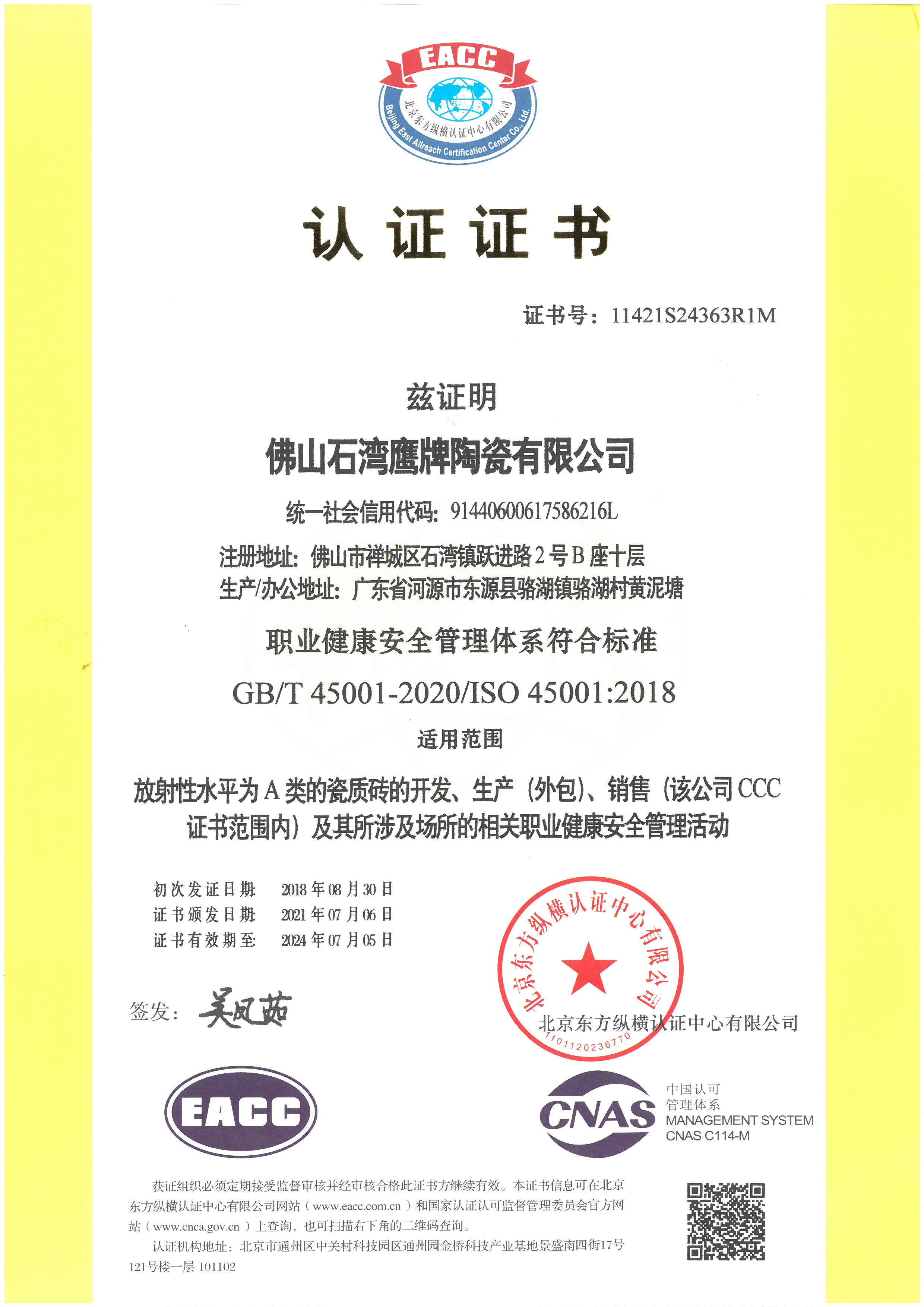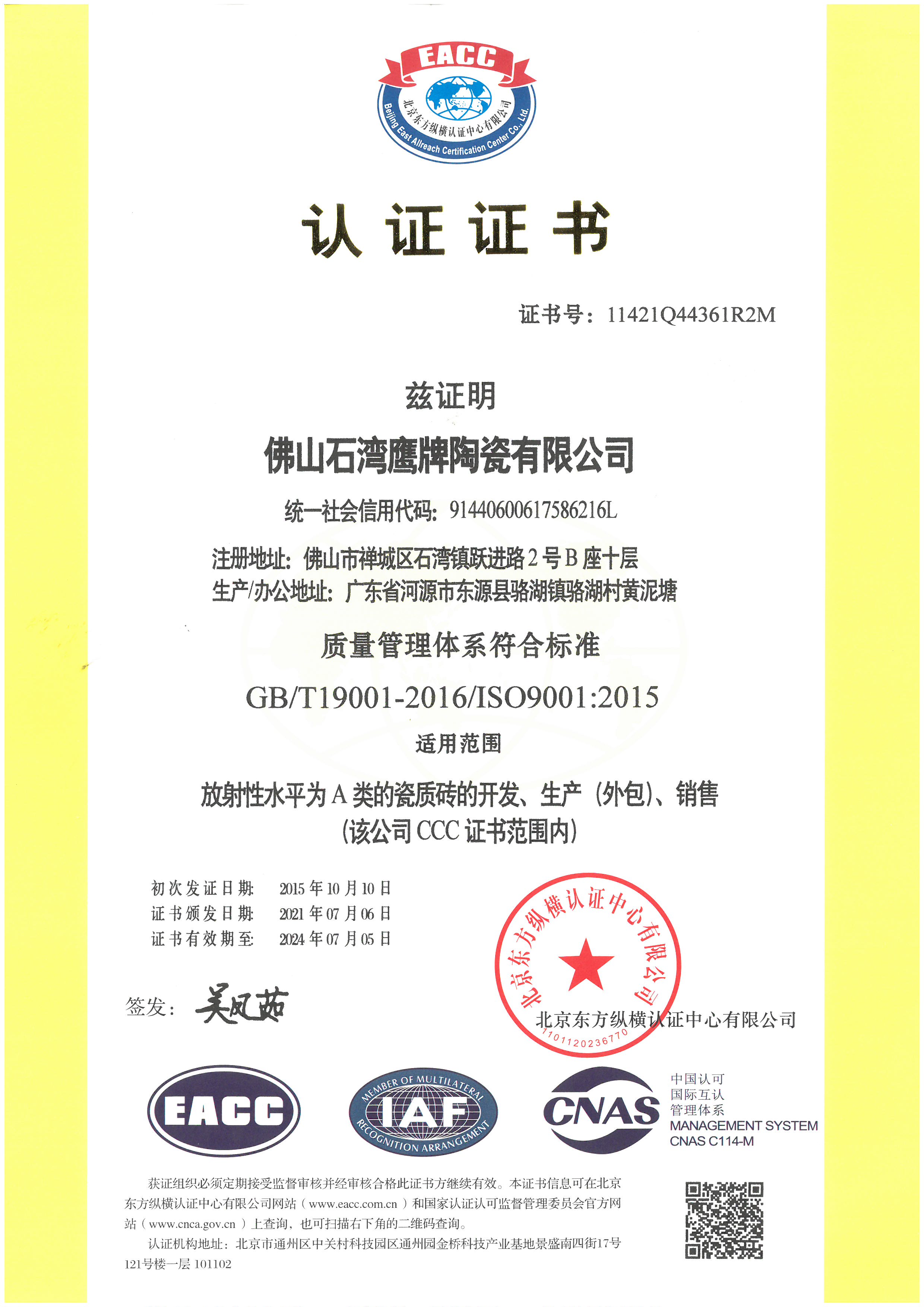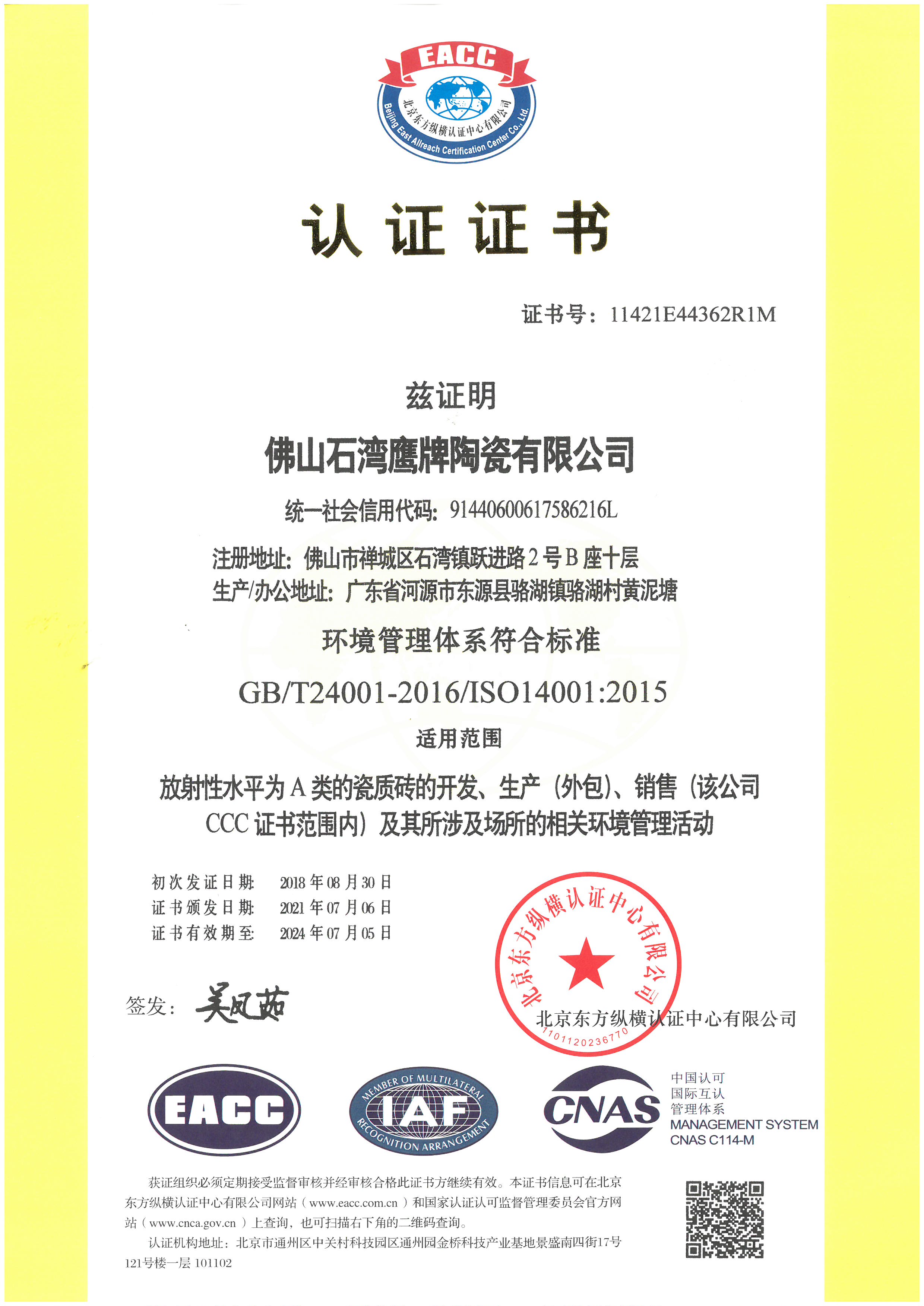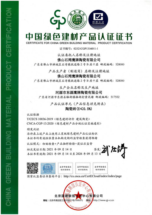 • 綠色建材目錄證書(地面瓷磚、墻面瓷磚)