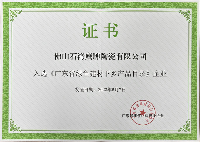 • 石灣鷹牌入選《廣東省綠色建材下鄉(xiāng)產(chǎn)品目錄》企業(yè)證書