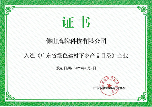 • 鷹牌科技入選《廣東省綠色建材下鄉(xiāng)產(chǎn)品目錄》企業(yè)證書