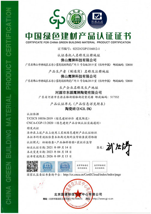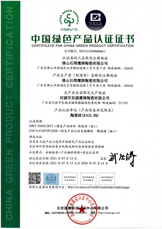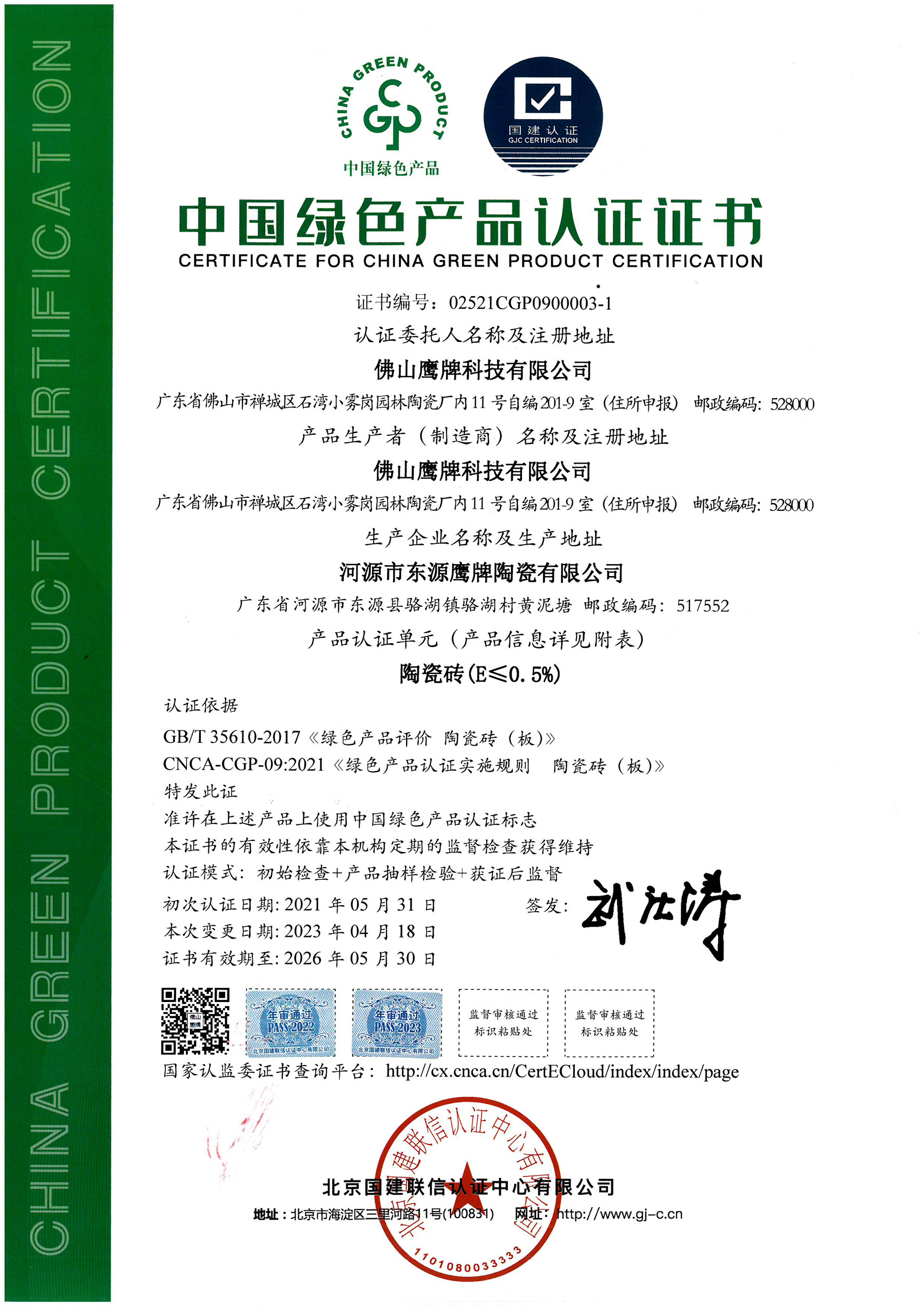 中國綠色建材產(chǎn)品認(rèn)證證書(鷹牌科技)